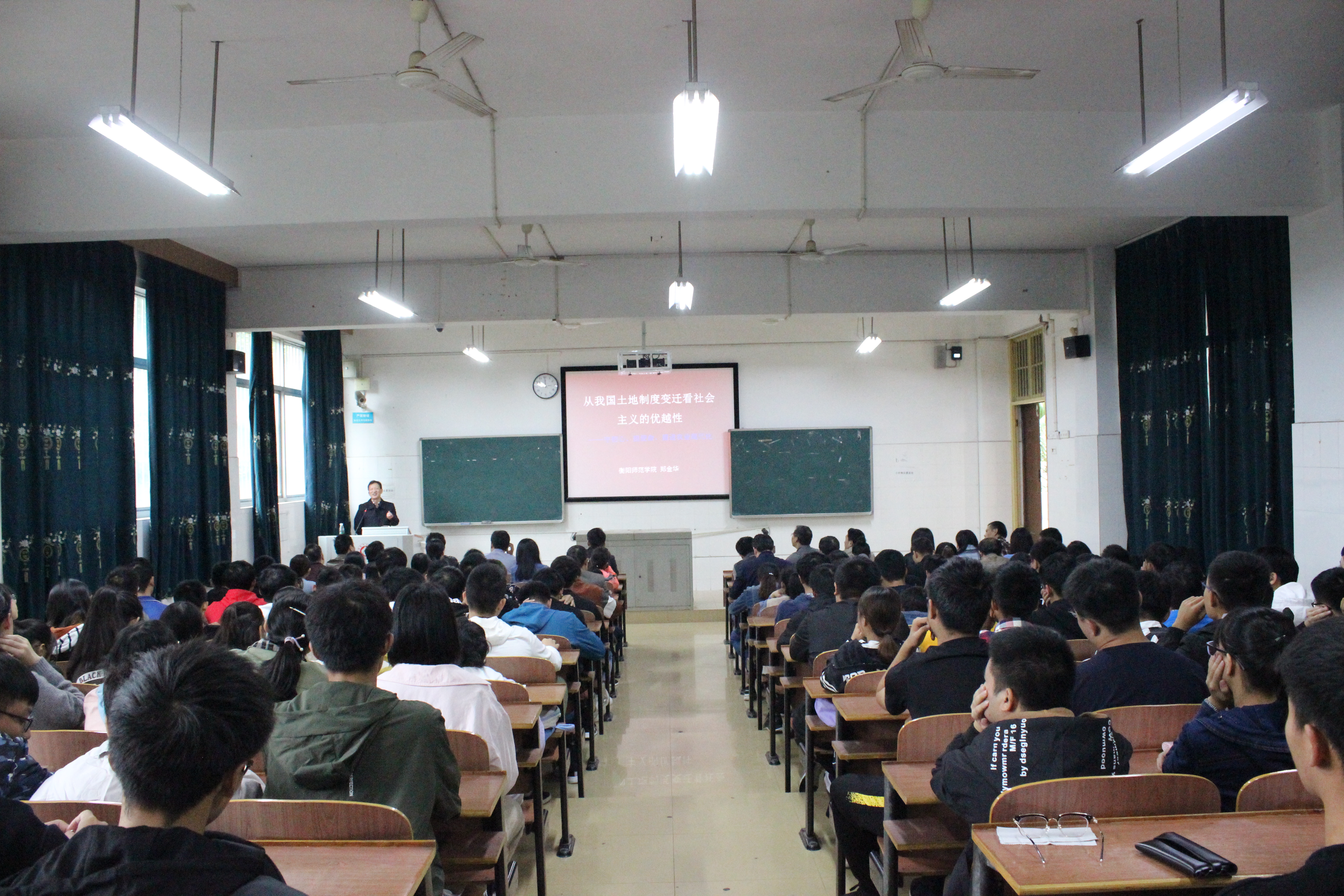 接着郑校长讲到毛泽东土地思想、邓小平土地政策以及胡锦涛农业政策的历史贡献:毛泽东提出并实施的平均分配土地,破解了中国自春秋战国以来土地资本过度集中的难题。使人民公社制度实现了土地公有化,从制度上彻底解决了土地被兼并而导致的土地资本占有不公平的问题,为改革开放后实行农村土地家庭承包责任制创造了条件。邓小平土地政策实行家庭联产承包责任制,解放了农业生产力,提高了农民的生产积极性,使广大农民解决了吃饭问题,彻底改变了几千年来我国人民“忍饥挨饿、缺吃少穿、生活困顿”的生存状态。胡锦涛农业政策从2006年1月1日起,我国全面取消农业税。郑校长强调我们应该继承和发展中国特色社会主义理论体系。并分别详细讲解了邓小平理论、‘三个代表’重要思想、科学发展观、以及习近平新时代中国特色社会主义思想。