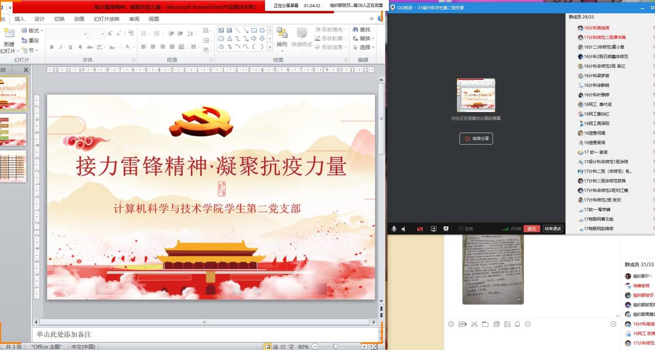 为号召广大党员接力和传承雷锋精神、争做时代新人,用中国精神凝聚起战胜疫情的磅礴力量。并引导广大党员积极投身疫情防控工作,用无私奉献铸造抗疫力量,彰显时代新人的责任担当,让雷锋精神闪耀光芒。365官网学生第二党支部于2020年3月25日在QQ上通过线上交流的方式开展了以“接力雷锋精神,凝聚抗议力量”为主题的党日活动。