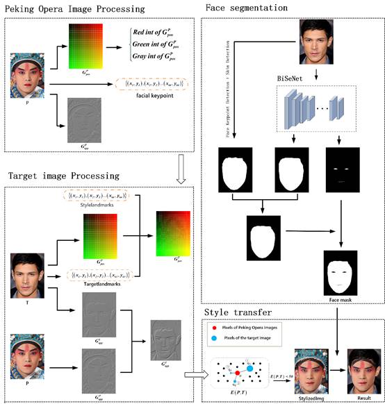 该论文是在我校梁小满教授的指导下完成,beat365官方网站、智能信息处理与应用湖南省重点实验室为署名单位。论文核心理论是:当使用标准的神经网络迁移方法进行人像风格迁移时,往往不能保证语义上的正确转移;风格实例中的纹理细节往往被忽略。本文提出了一种名为POFMakeup的京剧脸谱风格转移方法,方法的技术路线如图1所示。这种方法可以将带有京剧脸谱的人像的风格转移到另一个人像上。该方法使用两个指南,位置指南和外观指南。位置指南保证了转移过程中语义的一致性,而外观指南则保证了转移过程中目标对象的外观能够被保留下来。实验结果表明,该方法不仅解决了传统人像风格转换的问题,而且能够快速、完美地实现京剧脸谱的风格转换。提出的方法在结构相似度(SSIM)方面比传统方法提高了17%。