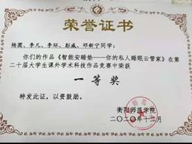 找到几个志同道合的学习伙伴后,杨圆担任组长,几个人分工合作,合力完成项目。由于几个人都没有项目经验,杨圆也是第一次当项目组组长,几个人面临的困难可想而知。从项目功能的初步确定到各个部分功能的完成,再到各个模块的通信,都需要不断地学习,沟通、修改,为此组员们常常会感到气馁,产生想放弃的念头。作为组长的她,时常鼓励大家继续坚持,用平常心对待。随着比赛时间的逼近,杨圆在做项目的过程中顶着的各项压力也越来越大。这让她也几近崩溃,但是她并没有放弃,常常在厕所擦干眼泪后回来继续改代码、调试程序,踏踏实实地继续完成项目。“功夫不负有心人”!11月,他们凭借此项目在2020年(第四届)“强智杯”湖南省大学生物联网应用创新设计竞赛(创意赛)中斩获一等奖。