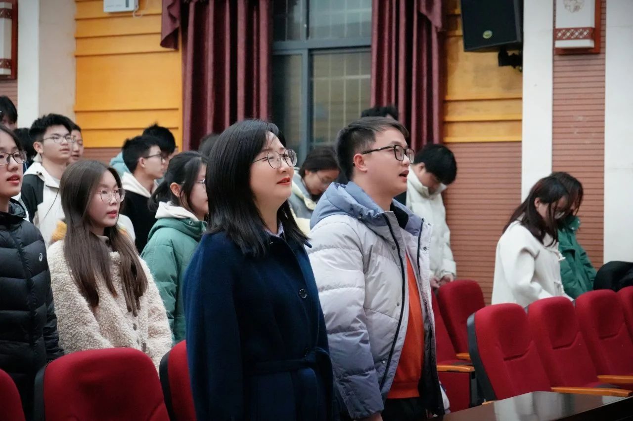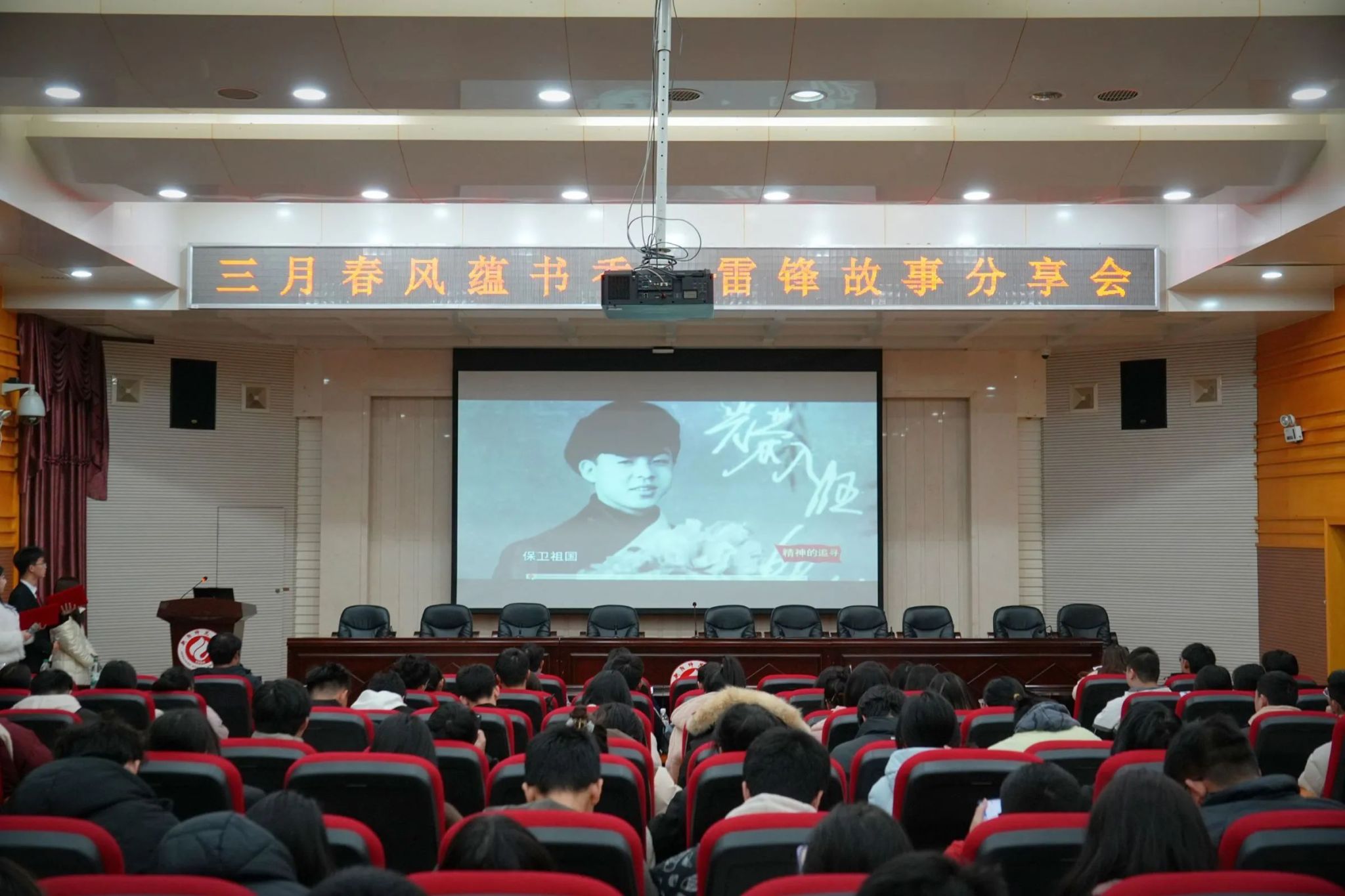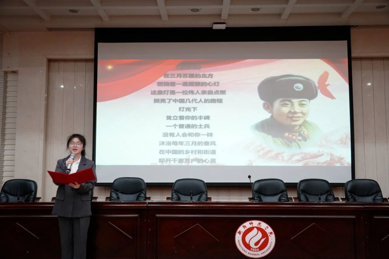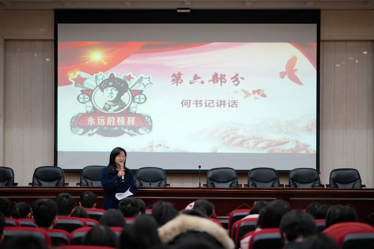 接着,在梁爱群同学的领诵下,全体师生起立,以激昂的语调合诵诗歌《雷锋颂》,配合大屏幕上“向雷锋同志学习”的红色标语与雷锋画像,声画交融间,铿锵诗句化作精神火炬,照亮了每一位学子的心田。