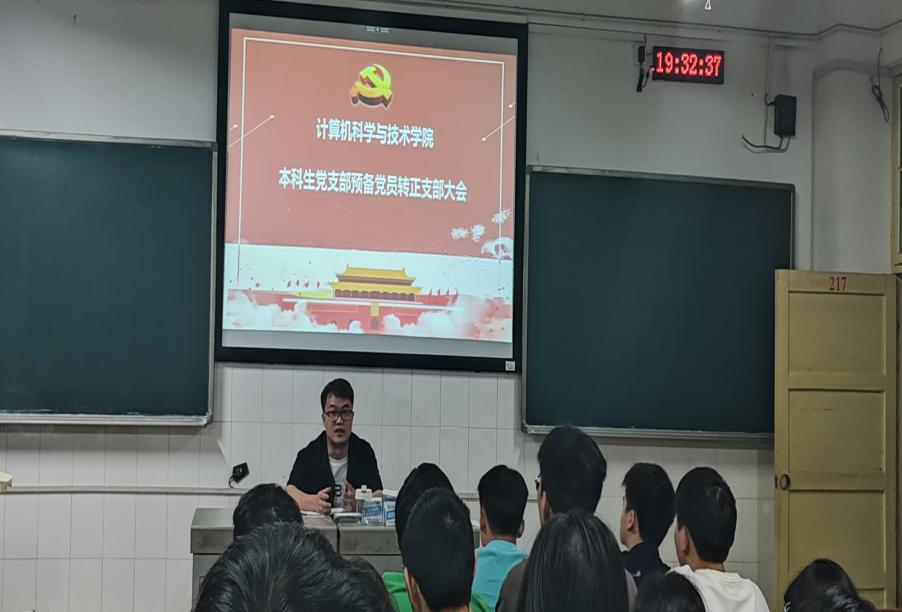 5月13日19:30,本科生党支部于计科楼217教室召开预备党员转正支部大会。会议伊始,曾振华老师对即将转正的预备党员表示祝贺,并强调:身为党员要树立大局意识,始终把个人的追求、自我价值的实现与党的奋斗目标紧密联系起来,在为人民服务的实践中充分体现人生的价值;他对与会党员提出8字希望:“凡人善举,最为动人”,期望各位同志能够从身边点滴小事做起,做一个合格的共产党员。