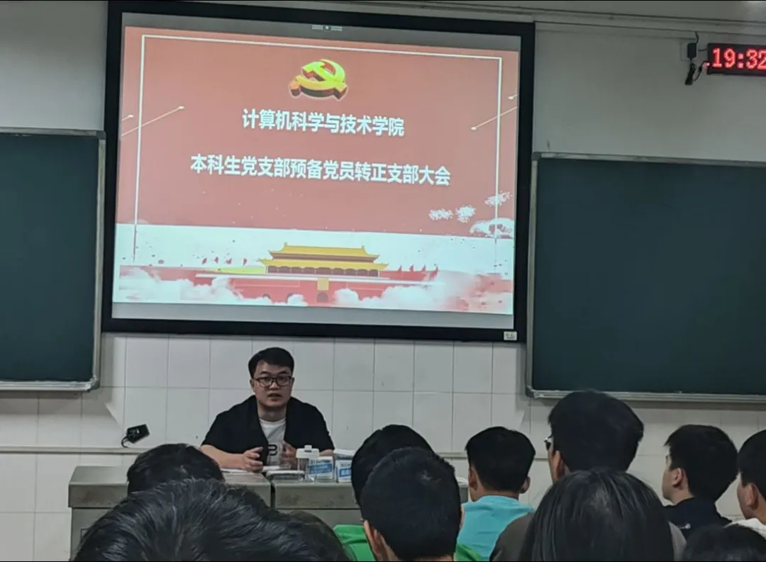 5月13日19:30,本科生党支部于计科楼217教室召开预备党员转正支部大会。会议伊始,曾振华老师对即将转正的预备党员表示祝贺,并强调:身为党员要树立大局意识,始终把个人的追求、自我价值的实现与党的奋斗目标紧密联系起来,在为人民服务的实践中充分体现人生的价值;他对与会党员提出8字希望:“凡人善举,最为动人”,期望各位同志能够从身边点滴小事做起,做一个合格的共产党员。