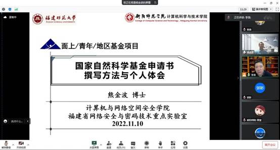 2022年11月10日20:00,365官网2023年度国家自然科学基金申报交流会使用腾讯会议线上召开,特邀福建师范大学熊金波教授作学术报告,会议由365官网院长李浪教授主持,beat365官方网站部分老师及研究生参加了此次会议。