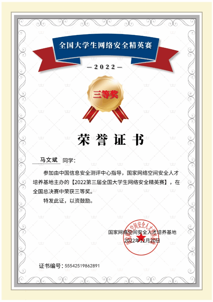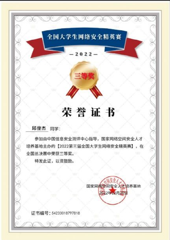 2022年12月18日,第三届全国大学生网络安全精英赛全国总决赛落下帷幕,beat365官方网站计算机学院2022级计科学子邱俊杰、马文斌荣获国赛三等奖。