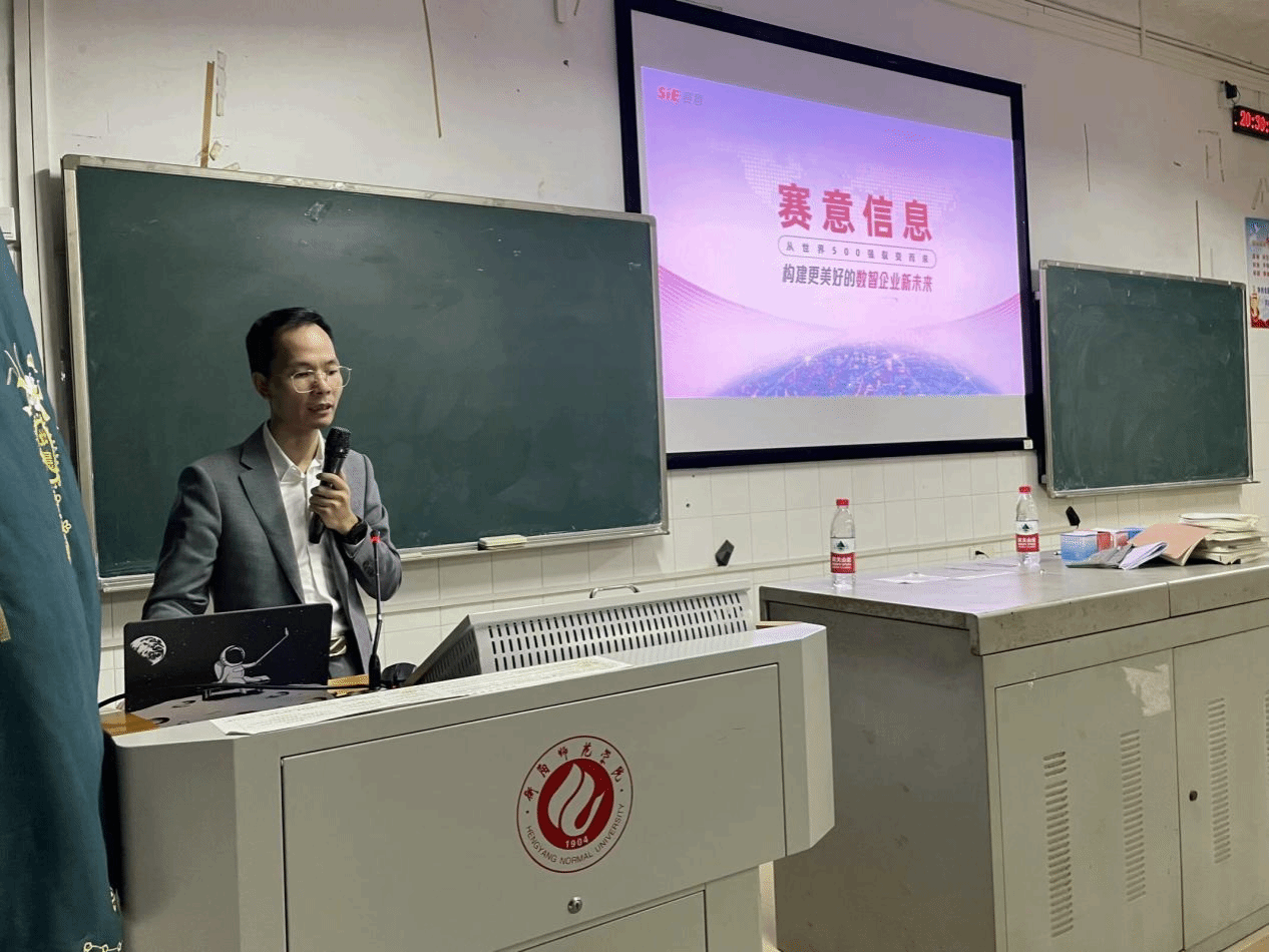 招聘负责人通过“为什么选择计算机软件专业?你心目中的程序员是什么样的?你了解的软件行业公司有哪些?”等问题引入了宣讲主题,为同学们详细介绍了赛意公司的发展历程、企业文化、业务范围以及未来的发展战略。他谈到公司多年来聚焦于工业互联网、智能制造、新一代信息技术、数字化转型等领域的技术与商业模式创新应用,以前瞻性视野和创新技术,帮助企业跨越数字化转型挑战,同时希望此次招聘宣讲能吸引到更多高执行力、高创新能力、高职业素质的赛意新星,未来与赛意一起勇往直前。